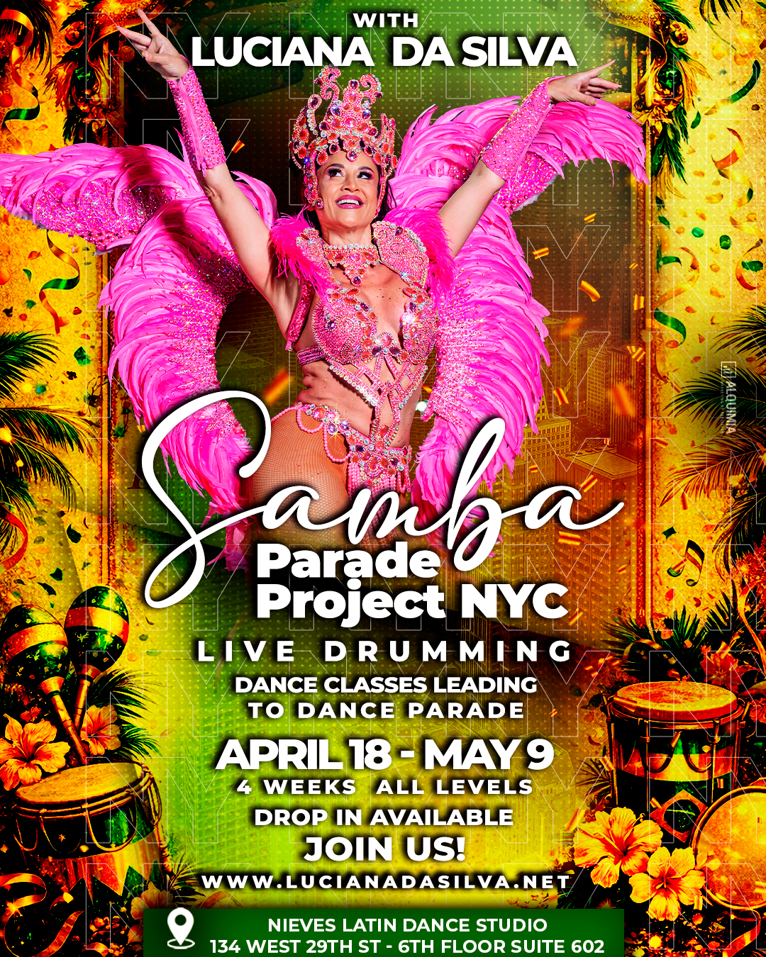 Samba Parade Project NYC Live drumming Dance classes leading to Dance ParadeApril 18 – May 94 weeks * All LevelsDrop in availableJoin Us!! Click here Nieves Latin Dance Studio, 134 West 29th St – 6º andar, sala 602